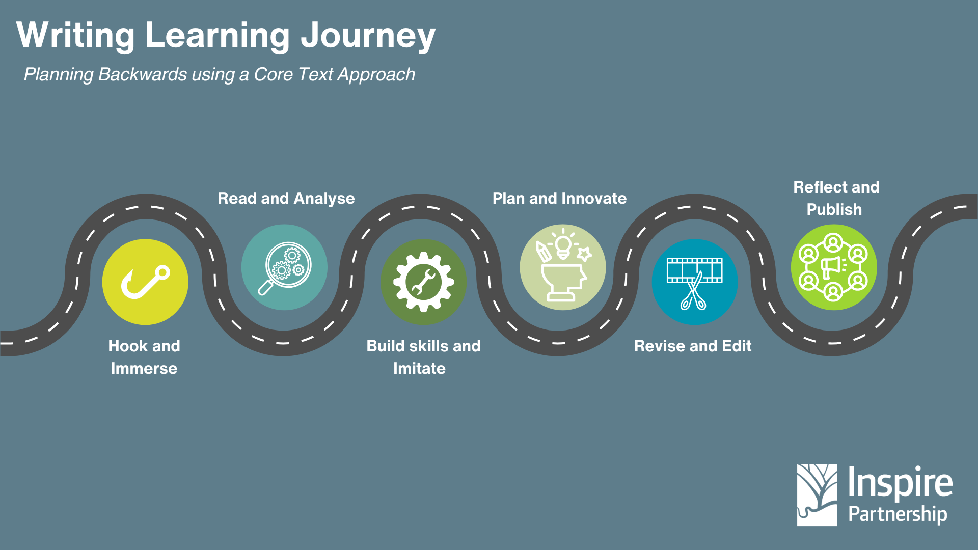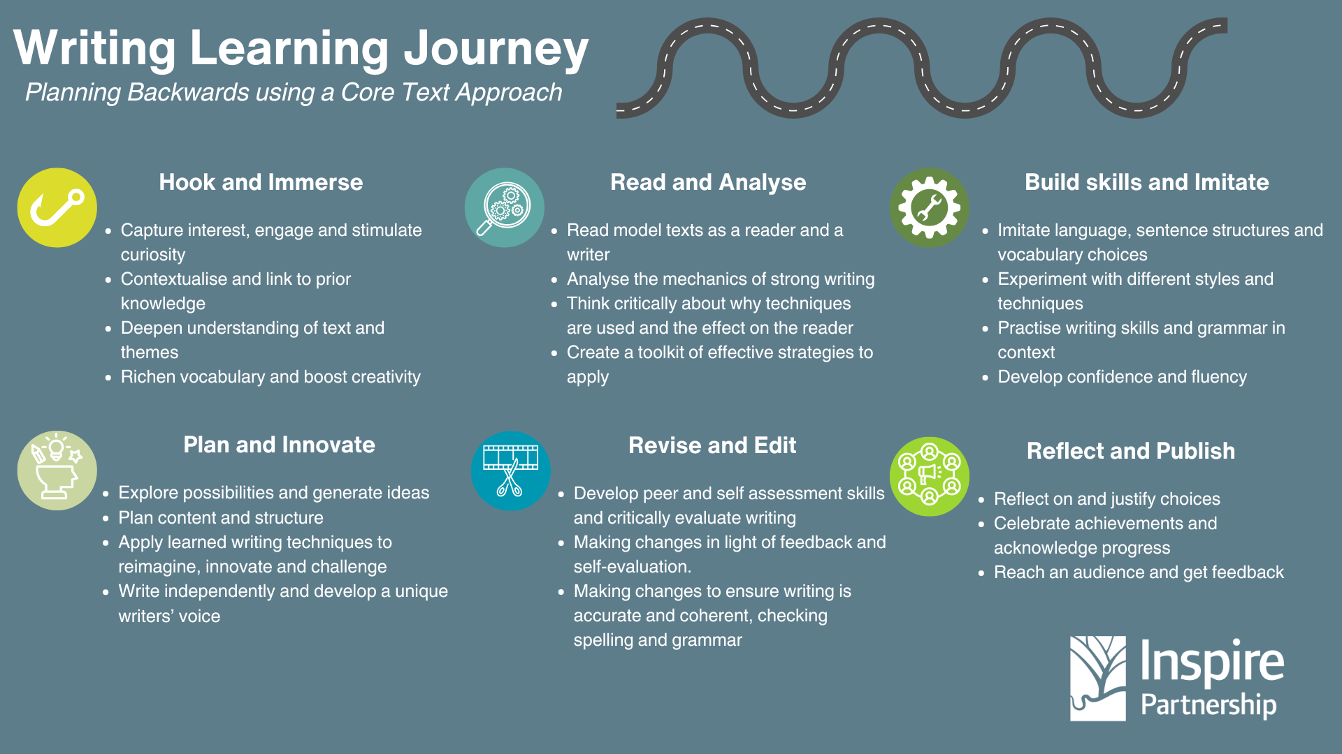 The writing learning journey below is used as a fluid framework to build up writing skills over a half term in order to achieve a high-quality, published writing outcome: